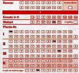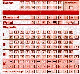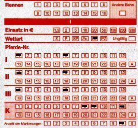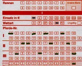 (Am unteren Ende muß man die Anzahl der Markierungen in den Feldern “Pferde-Nr.” eintragen, hier also “3”) - siehe den oberen, links stehenden Wettschein.