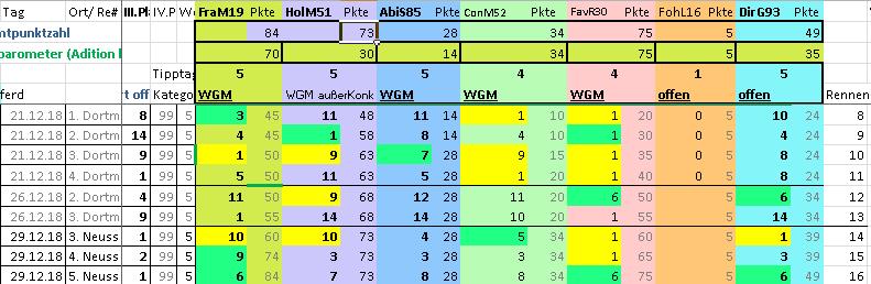 Doch allein schon die Teilnahme am Tipp-Spiel kann tolle Gewinner generieren. Schauen wir noch einmal auf den 21.12 und wir sehen, dass die Kombi FraM19 mit ConM52 / oder FavR30 die Dreierwette wäre (Einlauf 3-1-x), Im 3. Rennen hätte man mit dem Tipp von AbiS85 mit einem der anderen Vier Teilnehmer die Dreierwette (knapp 5.000) gebracht.