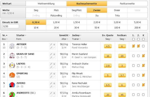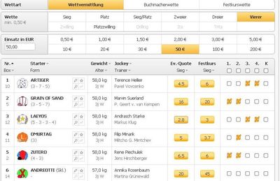 Bei Renntagen mit mehr als 10 Rennen (das ist eigentlich nur in Hamburg der Fall) sollen Sie die Rennen mit den meisten Startern unbewettet lassen, bis man auf sein Limit kommt.