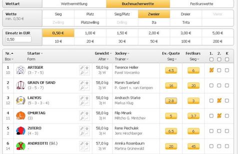 Und wo bleibt jetzt Ihr „eigenes Pferd“? Nun, jedes Pferd, welches Sie ich ausdenken (oder einfach einbauen wollen – Achtung! Nicht zu viele, das wird schnell zu teuer) schreiben Sie auf den 2. Platz. Auf diesem Platz kostet jedes Pferd 2 € extra. Also wenn Sie ein Pferd im Kopf (Bauch) haben, dann zahlen Sie 6 € - auch nicht die Welt, oder? (nur klicken Sie nicht wie im Beispiel 50 € an, das hätte 0,50 € werden sollen...)