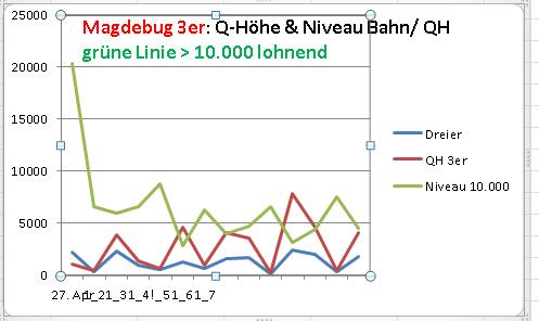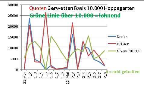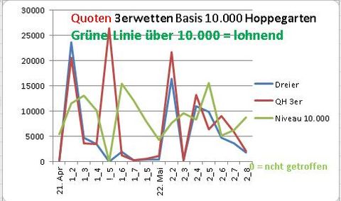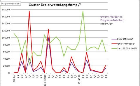. Haben Sie das gewusst?Schauen Sie auf die GRÜNE Linie bei der Zweierwette. Was fällt Ihnen auf? Genau: die "erwartete Quote" markiert diese Linie mit 1.000. Und wann ist diese Linie über 1.000? Genau, wenn die Zweierquote im untersten Bereich. Und wo ist die Kurve am weitesten (nach unten) weg von der 1.000? Auch richtig erkannt! Je höher die Quote, desto geringer die Auszahlung. Groschen gefallen? Ja, super: Die höher die Quote, desto höher der Einbehalt von PMU. Ist doch fair: Je mehr der Wetter gewinnt, desto tiefer greift PMU in dessen Tasche. Wenn er noch tiefer greift, dann hat das was PMU in der Hand hat zwar auch einen Bart, ist aber nicht der Schlüssel.... Bei der Dreierwette liegt die grüne Kurve noch sehr viel extremer ... doch das ist der Formelfehler, den die Buchmacher sich ausgedacht haben Insgesamt hat sich auch nach 3 Renntagen wenig geändert, die 3er Quoten haben sich der Jahreszeit entsprechend beruhigt.