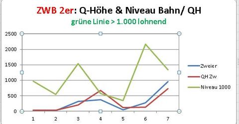 Nicht so ganz überrscht ist man, wenn man bei Zweibrücken eine Erwartungslinie hat, die trotz relativ angepaßter Linie Toto zu QU stark schwankt. Das hat eher mit der Logik zu tun. Wenn z.B: eine Quote rechnerisch (QH) 16.000 zahlen müßte, ist dies eine Barausszahlung von 1.600 € bei 1 € Grundeinsatz. Aber nicht in jedem Rennen ist der Auszahltopf so groß. Und schon klafft die Lücke auf. Umgekehrt ist es so, dass die Zuschauer im Schnitt weniger Wetterfahruung haben und deshalb schnell einem Zuruf des Moderators folgen- was dann ebenfalls Quotensprünge in beide Richtungen erlaubt. Und der dritte Faktor ist der, dass auf "kleinen Bahnen" oft zuwenig Starter vor Ort. Witzig wird es immer, wenn bei drei Pferden die Zweier, mehr als die Dreier zahlt. Reine Pychologie... Insgesamt nicht schlecht, die Zweierquote hängt ein wenig tief.