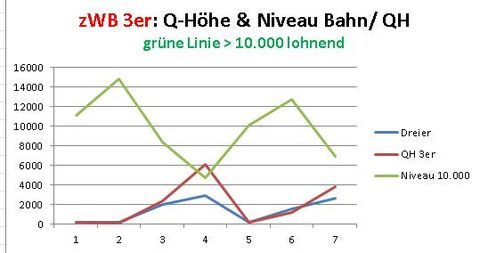 Um die Aussagekraft der Grafiken zu erhöhen habe ich nun die 2er und 3er Grafiken getrennt und habe die 100%-Linie in die Grafiken integriert (Grüne Linie) Die Erwartung (Rot) liegt ei der Dreier nur einmal - wenn auch extrem - über der Toto-Quote. Die grüne Linie ist bei der Zweierwette quasi immer über der (10%-Linie) Erwartung bei 1.000. Die Toto und QH 2erQuoten liegen fast aufeinander.