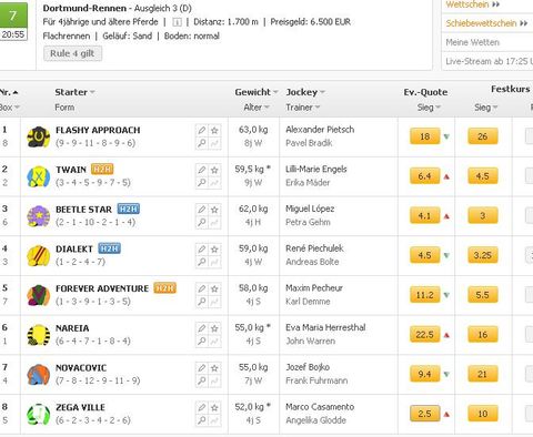 Machen Sie sich einfach am frühen Morgen des Renntages über die angebotenen Festquoten der Buchmacher her und vergleichen sie diese dann mit den aktuellen Toto-Quoten. Hier ein aktuelles Beispiel vom Renntag Dortmund am 12. Januar 2018 im 7. Rennen: