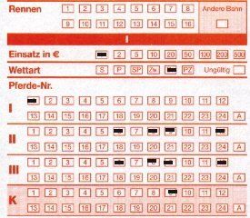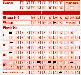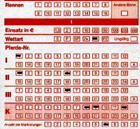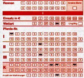 (Am unteren Ende muß man die Anzahl der Markierungen in den Feldern “Pferde-Nr.” eintragen, hier also “3”) - siehe den oberen, links stehenden Wettschein.
