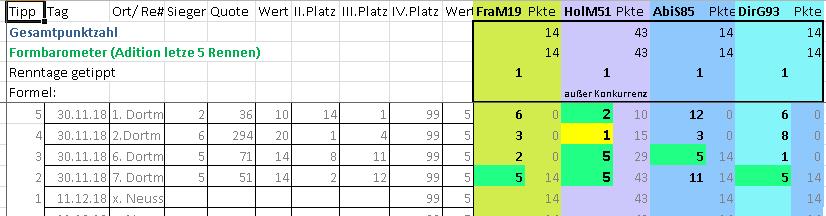 Doch allein schon die Teilnahme am Tipp-Spiel kann tolle Gewinner generieren. Schauen wir noch einmal auf den 21.12 und wir sehen, dass die Kombi FraM19 mit ConM52 / oder FavR30 die Dreierwette wäre (Einlauf 3-1-x), Im 3. Rennen hätte man mit dem Tipp von AbiS85 mit einem der anderen Vier Teilnehmer die Dreierwette (knapp 5.000) gebracht.