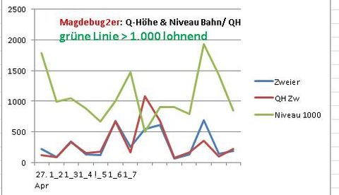 Nicht so ganz überrscht ist man, wenn man bei Zweibrücken eine Erwartungslinie hat, die trotz relativ angepaßter Linie Toto zu QU stark schwankt. Das hat eher mit der Logik zu tun. Wenn z.B: eine Quote rechnerisch (QH) 16.000 zahlen müßte, ist dies eine Barausszahlung von 1.600 € bei 1 € Grundeinsatz. Aber nicht in jedem Rennen ist der Auszahltopf so groß. Und schon klafft die Lücke auf. Umgekehrt ist es so, dass die Zuschauer im Schnitt weniger Wetterfahruung haben und deshalb schnell einem Zuruf des Moderators folgen- was dann ebenfalls Quotensprünge in beide Richtungen erlaubt. Und der dritte Faktor ist der, dass auf "kleinen Bahnen" oft zuwenig Starter vor Ort. Witzig wird es immer, wenn bei drei Pferden die Zweier, mehr als die Dreier zahlt. Reine Pychologie... Insgesamt nicht schlecht, die Zweierquote hängt ein wenig tief.